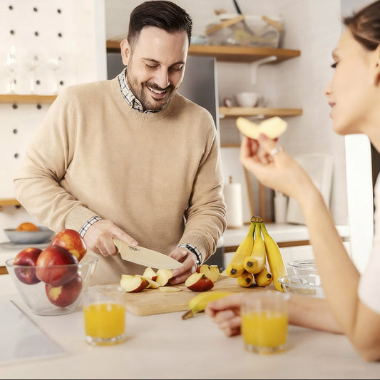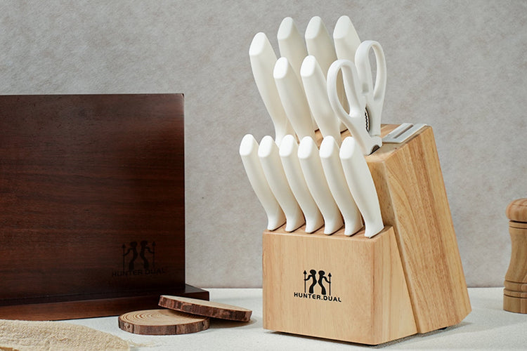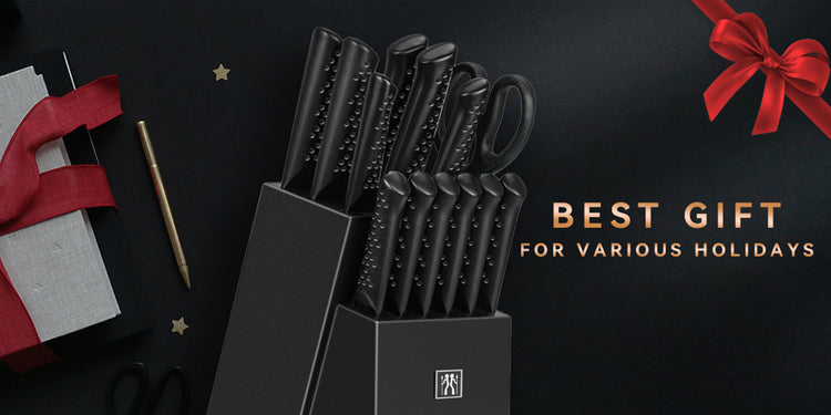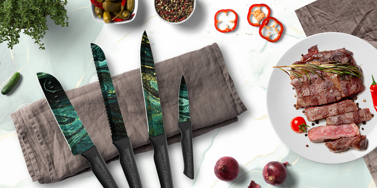 This knife set looks so pretty — my friends also said it looks really nice. The knives are sharp and cut things really quickly. The set is complete too, with knives for bread, fruits, and more. Great quality and great design!