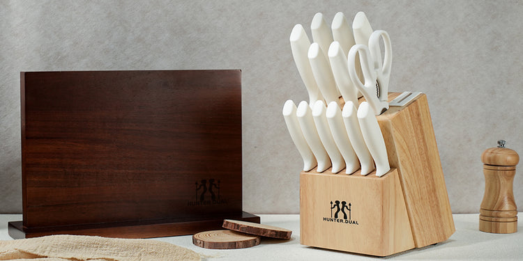 Super quality! Heavy duty! A bit heavy, but I like that. Not too heavy, though. Very sharp! Nice blade covers so that you don't have to worry about cutting yourself. Knife sharpener included. Feels good in your hand. Highly recommend! 👌🏻 Great value!