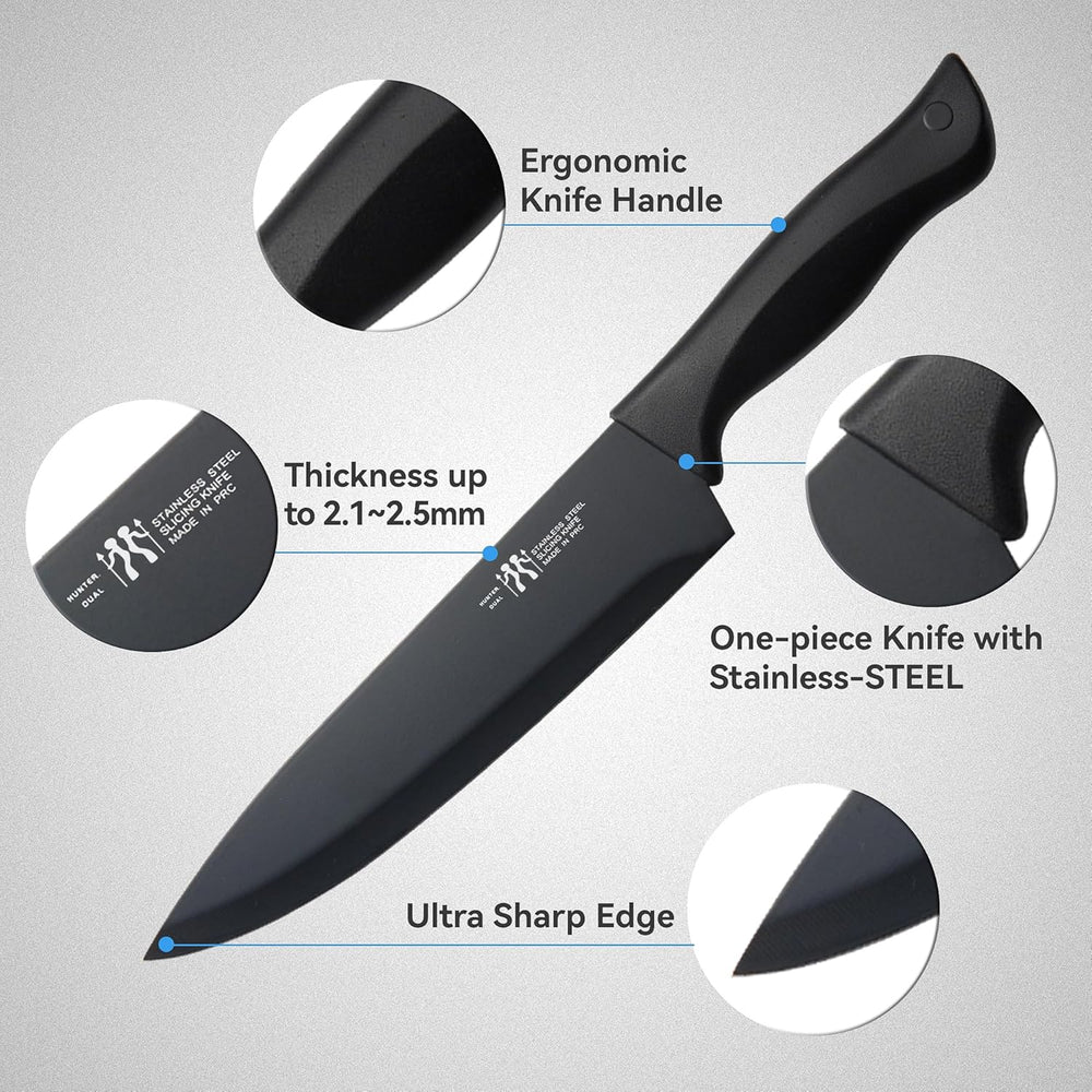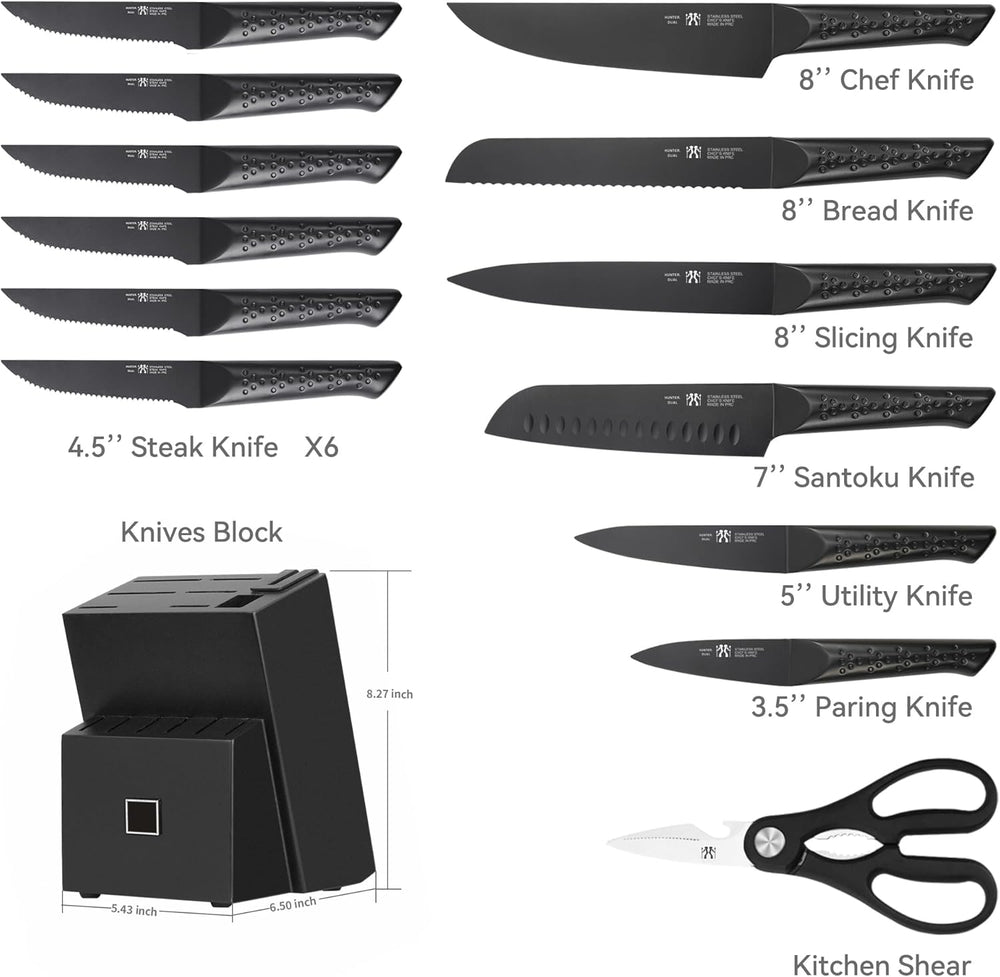 Love the knife set, had it for a while now.... haven't had any issues with it.... only problem was when I first got it the one spot for one of the larger knives where it should go in wasn't fully hallowed out for it to slide into so we are not able to store it in there and have to keep it somewhere else, other than that the knives are good quality and sharp.... still sharp from when I first purchased them
